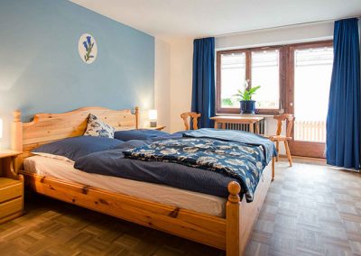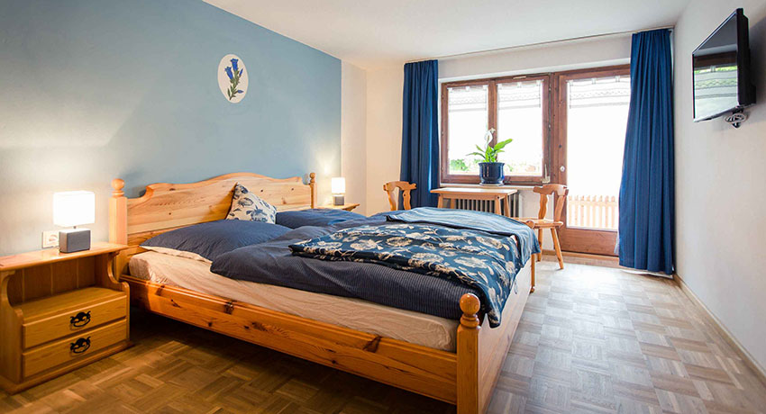 Enzian Zimmer im Goldiger Hirsch – In warmen Blautönen träumen, vom Balkon die Berge bestaunen und alpine Gemütlichkeit genießen.